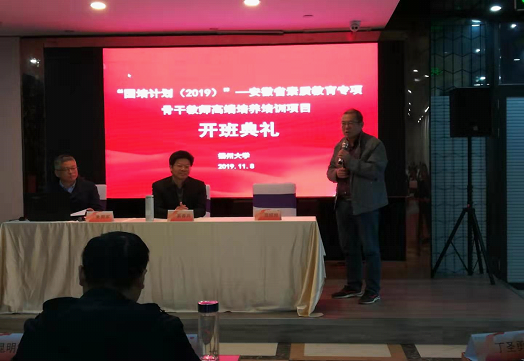 2019年11月8日,由教育科学学院承办的“国培计划(2019)”——安徽省素质教育专项骨干教师高端培养培训项目顺利开班。朱拥军副院长对参培安徽老师的到来表示热烈的欢迎;向大家详细介绍了扬州大学的办学历史和扬州文化,并详细解读了本次培训方案。安徽省六安市望城岗小学的翁绍旭老师作为学员代表做了表态发言。