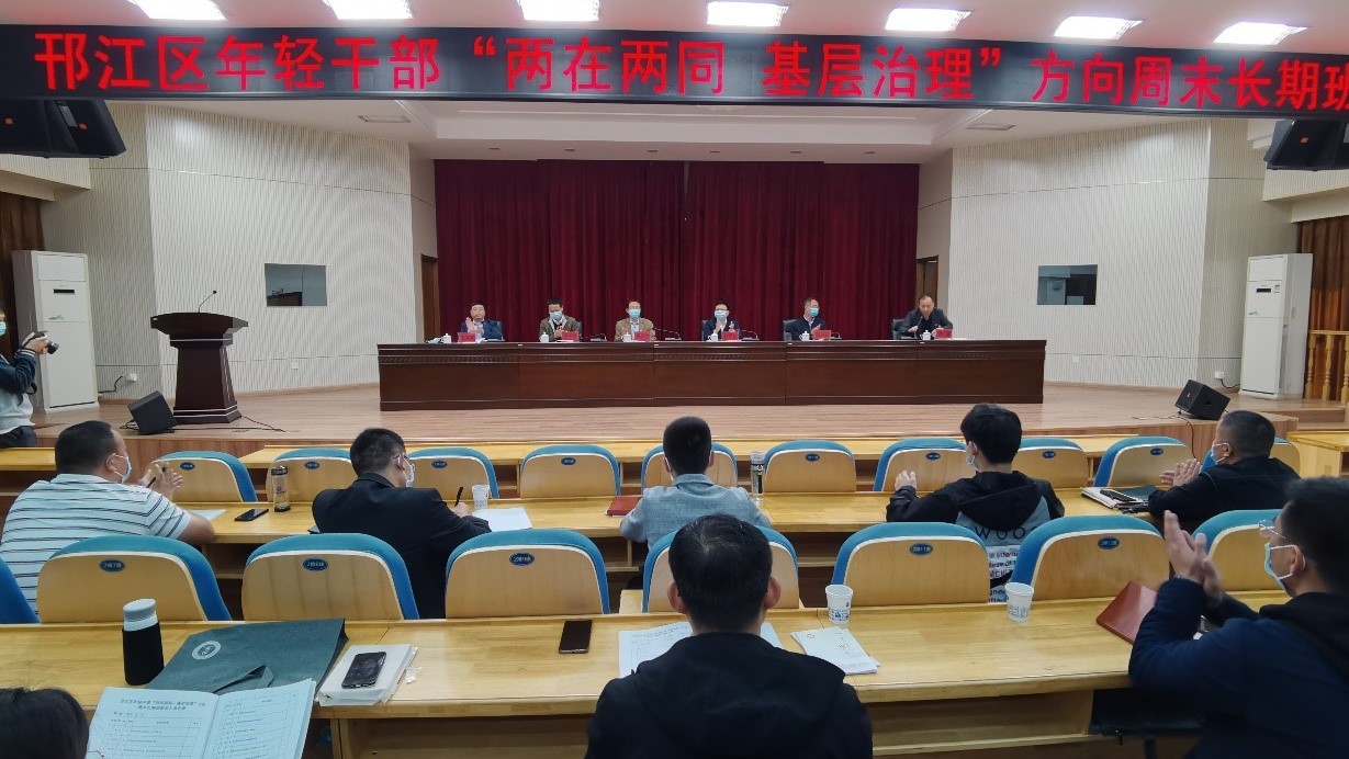 2021年10月30日上午,“邗江区年轻干部“两在两同·基层治理”方向长期培训班”开班典礼在邗江区党校报告厅举行,邗江区委常委、组织部部长、邗江党校校长孙爱东,扬州大学常委、组织部部长薛小平出席开班典礼并讲话,邗江区委组织部副部长、党建办主任王文军主持。